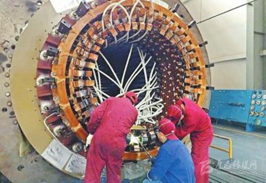 2月22日,在東方電機發電機分廠,工人們正對中煤五彩灣4號機定子進行高工位電路焊接。 東方電氣集團東方電機有限公司供圖