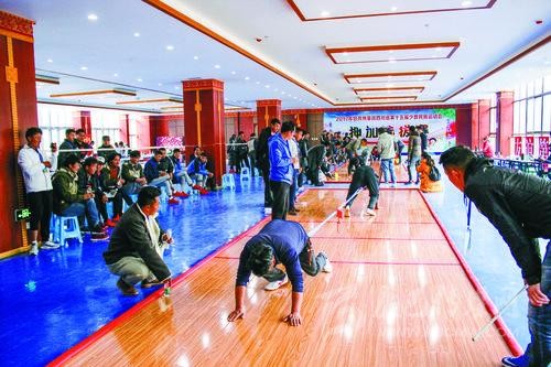 今年,我州將由115名運動員、教練員等組成11支運動隊,參與賽事設置的8個競賽項目和2個表演項目,其中有兩支隊伍將參與綜合類表演項目比賽。我州總參賽人數相比上一屆略有減少。我州參加綜合類表演項目比賽的節目是《瑪亞切通》和《炯動》。《瑪亞切通》譯為孔雀吃水,主要體現力量和平衡的動作;《炯動》取材于藏民族農村修建房屋時的勞動場面,以青年男女在勞動過程中載歌載舞對歌或比拼勞動成果、質量、進度為內容,主要比拼身體的力量和靈活度。我州參加競技類表演項目比賽的節目是《嘎久》。《嘎久》意為翻閱馬鞍或吉祥翻越,是藏族人民節日聚會時的一種競技體育活動,主要比拼靈活性、趣味性和技巧性。