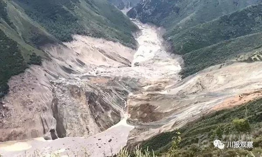 另據四川省防指和四川省水利廳工作組反饋:堰塞湖所在江段長約10.6公里,河谷為“V”形峽谷,兩側岸坡坡度20~60°,河谷結構為斜向谷。河道上游彎曲、下游稍順直,水流急,局部稍緩。初步統(tǒng)計,該段江段共有滑坡10處,崩塌3處,泥石流溝8條。其中有2處大型滑坡,即則學滑坡和仁達滑坡。