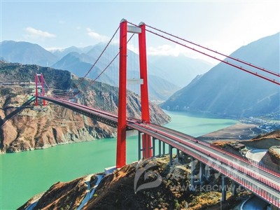而在瀘定大渡河特大橋康定岸約200米處的公路堡坎上,寫著毛澤東主席的《七律·長征》一詩。一句“大渡橋橫鐵索寒”道出了大渡河的艱險,而如今,在這波濤洶涌的大河上,建起了如此雄偉的大橋,解決了出行難題,帶來了福祉,將促進藏區經濟社會發展,真是讓“高原人民盡開顏”。