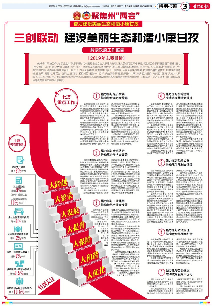 肖友才指出,今年發展形勢更加復雜、發展任務更加繁重,我們必須緊緊抓住大有可為的重要戰略機遇期和政策紅利“窗口期”,統籌兼顧、突出重點、突破難點,全力保持經濟社會高速度與高質量并重發展良好態勢,重點做好以下工作:一是強力抓好經濟發展,推動綜合實力大跨越。堅持把項目投資作為推動高質量發展的重中之重,全力確保完成全社會固定資產投資460億元以上、地區生產總值突破“三百億”大關;深化商貿流通領域改革,強力拓展消費市場,健全“圣潔甘孜”產品質量標準體系,實現社會消費品零售總額112億元以上;堅定不移支持民營經濟發展,力爭民營經濟市場主體突破6萬戶、民營企業突破8000戶,民營經濟增加值占GDP比重達到48%以上;堅持以供給側結構性改革為主線,強力推動各項改革任務落地見效。二是強力抓好全域旅游,推動旅游經濟大繁榮。堅定不移實施產業富民戰略,全力推進以全域旅游為核心的生態優先、綠色發展,強力構建“三環一帶兩濕地”發展格局,全力打造世界重要旅游目的地和國家全域旅游示范區;堅持把建設國際生態文化旅游目的地作為重要工作,全力打響中國最美雪山、中國最美濕地、中國最美草原、中國最美藏寨、中國最美漢子“五張名片”,強力培育生態文化旅游品牌。三是強力抓好工業強州,推動特色產業大發展。堅定不移實施工業強州戰略,堅持“優先發展新興產業、大力發展農特加工產業、有序發展電礦產業,大建園區、建大園區,大建基地、建大基地,大建產業、建大產業”思路,強力推進產業向園區集中;堅持以建設國家級清潔能源基地為統攬,積極穩妥開發礦產資源,積極發展戰略性新興產業,強力推進電礦向高端集群;堅持以建設現代高原特色農牧業基地為重點,深入推進農業供給側結構性改革,強力推進龍頭向基地集聚。四是強力抓好統籌協調,推動城鄉面貌大提升。堅定不移實施城鄉提升戰略,堅持“七管齊下”“四態合一”的思路,做強縣城、做優鄉鎮、做美村寨,全面推進城鄉建設提檔升級;堅定不移實施鄉村振興戰略,編制完成全州鄉村振興戰略規劃和18個縣(市)鄉村振興規劃,全面推進鄉村振興試點示范;堅定不移實施交通先行戰略,強力打好第四輪“交通大會戰”,全面推進區域綜合交通樞紐;高標準編制災后重建實施方案和項目清單,強力推進金沙江白格堰塞湖災后恢復重建。五是強力抓好脫貧攻堅,推動民生民利大保障。堅定不移實施扶貧攻堅戰略,堅持把脫貧攻堅作為最大的政治責任、最大的民生工程、最大的發展機遇,決戰決勝脫貧攻堅;深入實施教學質量提升工程,深化醫療衛生體制改革,完善公共文化服務體系,全力辦好社會事業;堅持就業優先,大規模開展職業技能培訓,全面實施全民參保計劃,依法保障退役軍人合法權益,持續推進城鎮棚戶區改造,全力做好水電移民安置工作,筑牢社會保障體系;堅定不移實施生態文明建設戰略,嚴格落實“三線一單”制度,強力推進國家生態文明建設示范區創建,提升生態民生福祉。六是強力抓好依法治理,推動社會局面大和諧。堅定不移實施依法治州戰略,深化“三區”維穩體系和依法常態化治理,深入開展反分裂斗爭,建設更高質量的平安甘孜;堅定不移把社會管理納入法治化軌道,鞏固更加和諧的民族宗教關系;堅定不移落實安全生產“黨政同責、一崗雙責、齊抓共管、失職追責”責任制,構建更大密度的安全監管網絡。七是強力抓好自身建設,推動政務服務大優化。堅持依憲施政、依法治政,自覺運用法治思維和法治方式推進政府工作,堅決讓公平和正義成為常態;完成新一輪政府機構改革,形成職責明確、依法行政的政府治理體系,堅決用實干和效率贏得民心;全面落實從嚴治黨主體責任,把經濟社會發展與黨風廉政建設同部署、同安排、同考核,堅決把紀律和規矩挺在前面。