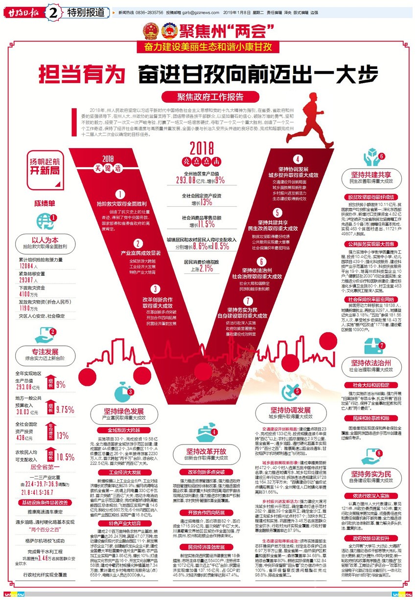 州人民政府州長肖友才代表州政府作工作報告?!墩ぷ鲌蟾妗酚扇糠纸M成:2018年工作回顧;2019年主要目標;2019年重點工作。