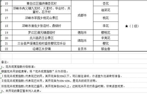 特別是,成都市金堂縣轉龍鎮鮮花山谷景區的紫堇花、金堂縣廣興鎮寶塔山櫻花公園的海棠花、新津縣花舞人間景區的郁金香、都江堰市玫瑰花溪谷景區的虞美人、攀枝花市米易縣普威鎮新龍村、龍灘村的油菜花、米易縣新山鄉坪山村的山茶花、德陽市中江縣輯慶鎮鐘樓村的櫻花、宜賓市屏山縣中都鎮民建村的油菜花、翠屏區金坪鎮金蘭花谷景區的一串紅、達州市達川區百節鎮烏梅山景區的烏梅花、眉山市青神縣海棠竹溪公園的海棠花、甘孜州瀘定縣杵坭鄉的櫻桃花都已進入盛花期。