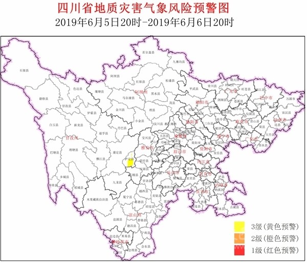 四川在線消息(記者 寇敏芳)6月5日,省自然資源廳發布全省地質災害氣象風險預警。結合四川省氣象臺天氣預報情況,6月5日20時~6月6日20時,全省地質災害氣象風險預警等級為3級(黃色預警,注意級),具體結果如下: