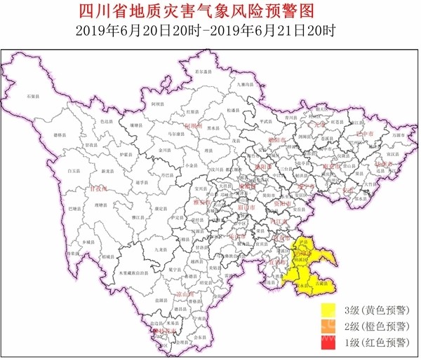 四川在線消息(記者 寇敏芳)6月20日,省自然資源廳發布全省地災氣象風險預警。結合四川省氣象臺天氣預報情況,6月20日20時~6月21日20時,全省地質災害氣象風險預警等級為3級(黃色預警,注意級),具體結果如下:
