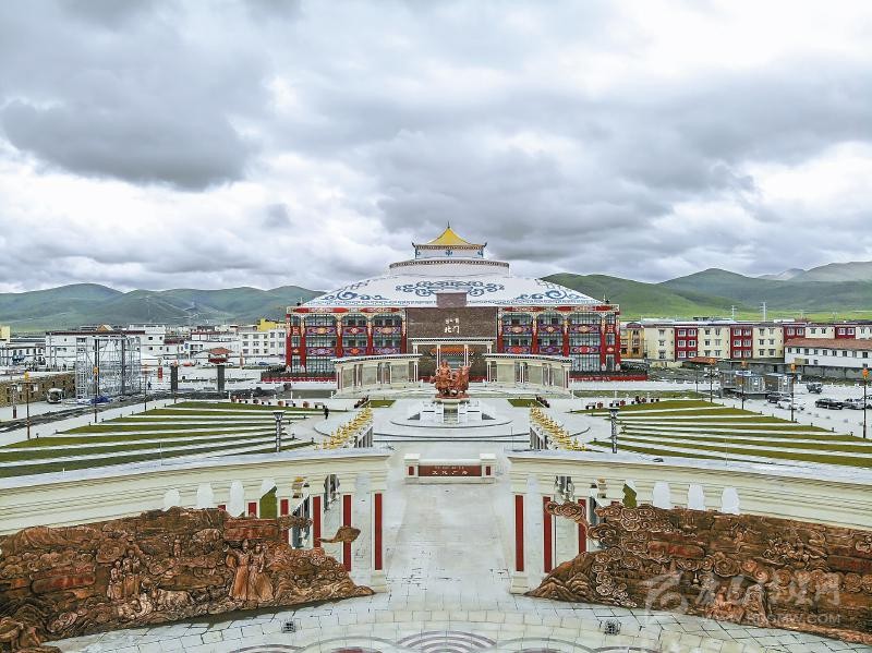 活動中心最“惹眼”的建筑,是一棟外形神似牧區帳篷的三層主體建筑。主體建筑的頂部,借鑒了石渠縣色須寺的外形設計,建筑外部的壁畫均為當地手工藝人親手繪制。活動中心的廣場上,以微縮的形式展現石渠縣最具代表性的景點,如石經城、石經墻等。