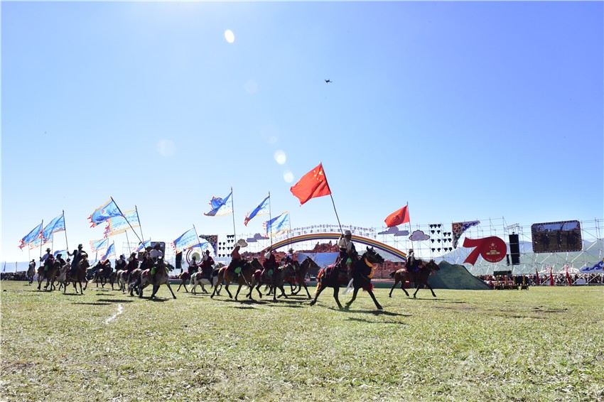 “四山旗似晴霞卷,萬馬蹄如驟雨來”。上午十點(diǎn),石渠縣四個(gè)片區(qū)組成的四個(gè)馬隊(duì)方陣高舉印有“世界最美濕地”“千年唐蕃古道”“石刻藝術(shù)王國”“吉祥太陽部落”字樣的四色彩旗,眾星拱月般簇?fù)碇腥A人民共和國國旗和慶祝中華人民共和國成立70周年活動(dòng)標(biāo)識(shí),策馬入場(chǎng),拉開了2019中國·石渠—太陽部落帳篷狂歡節(jié)的帷幕。