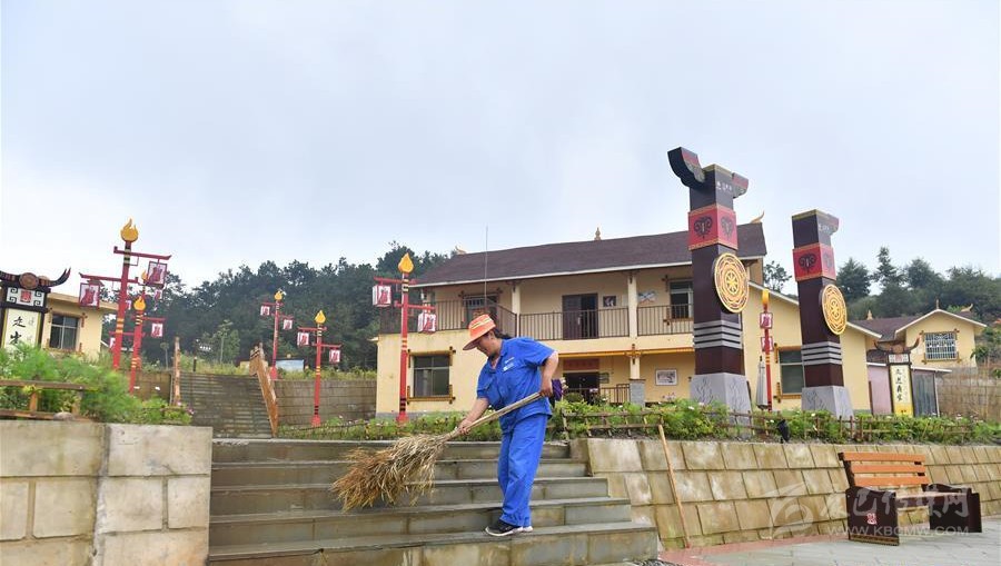9月7日,一名在景區工作的彝海村村民在清掃小廣場。