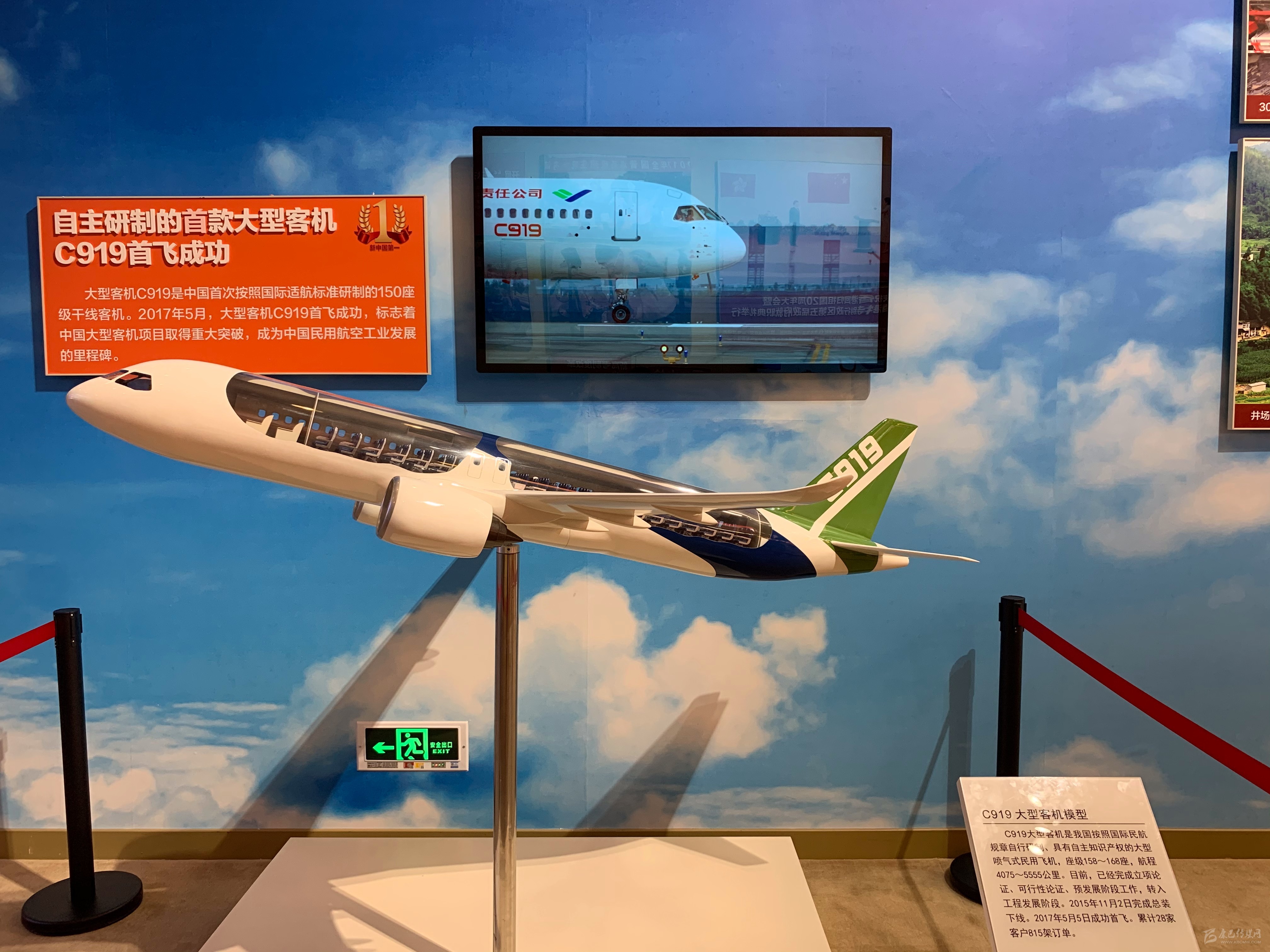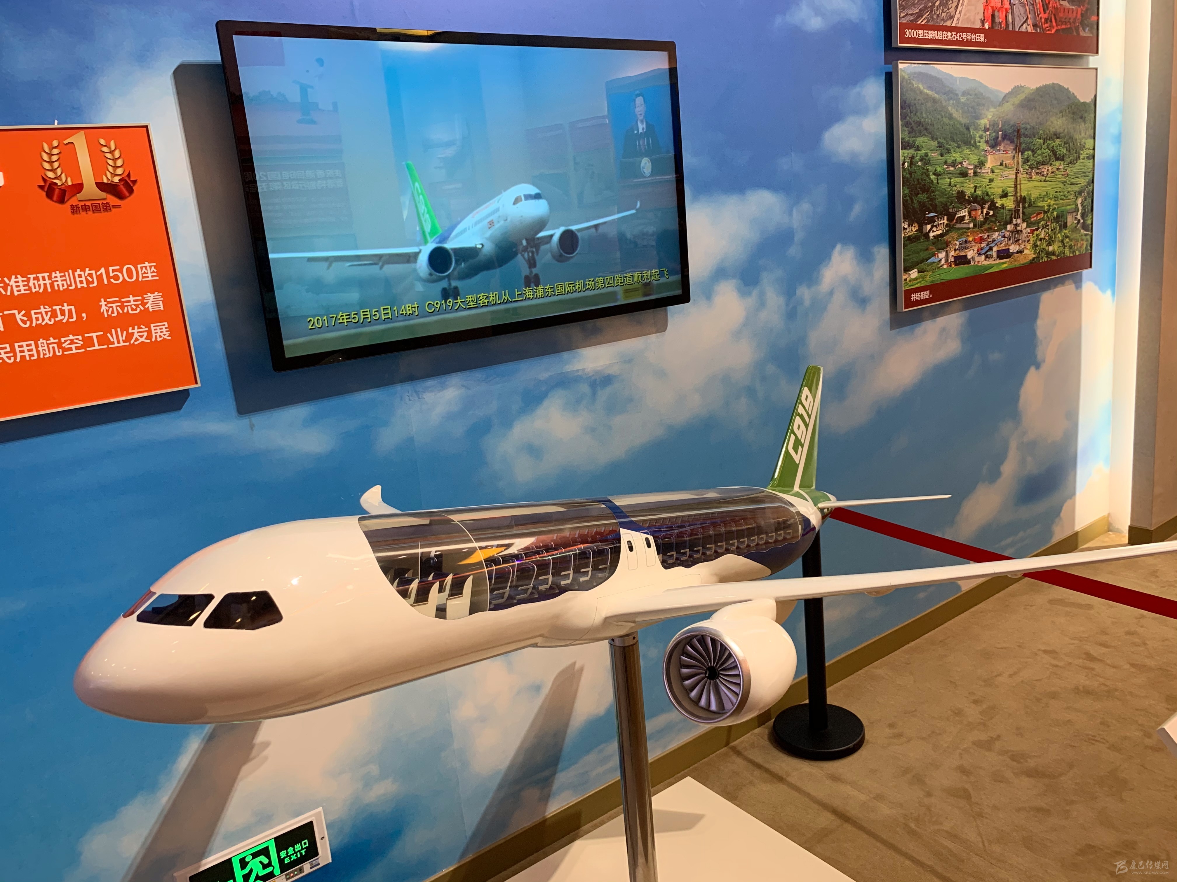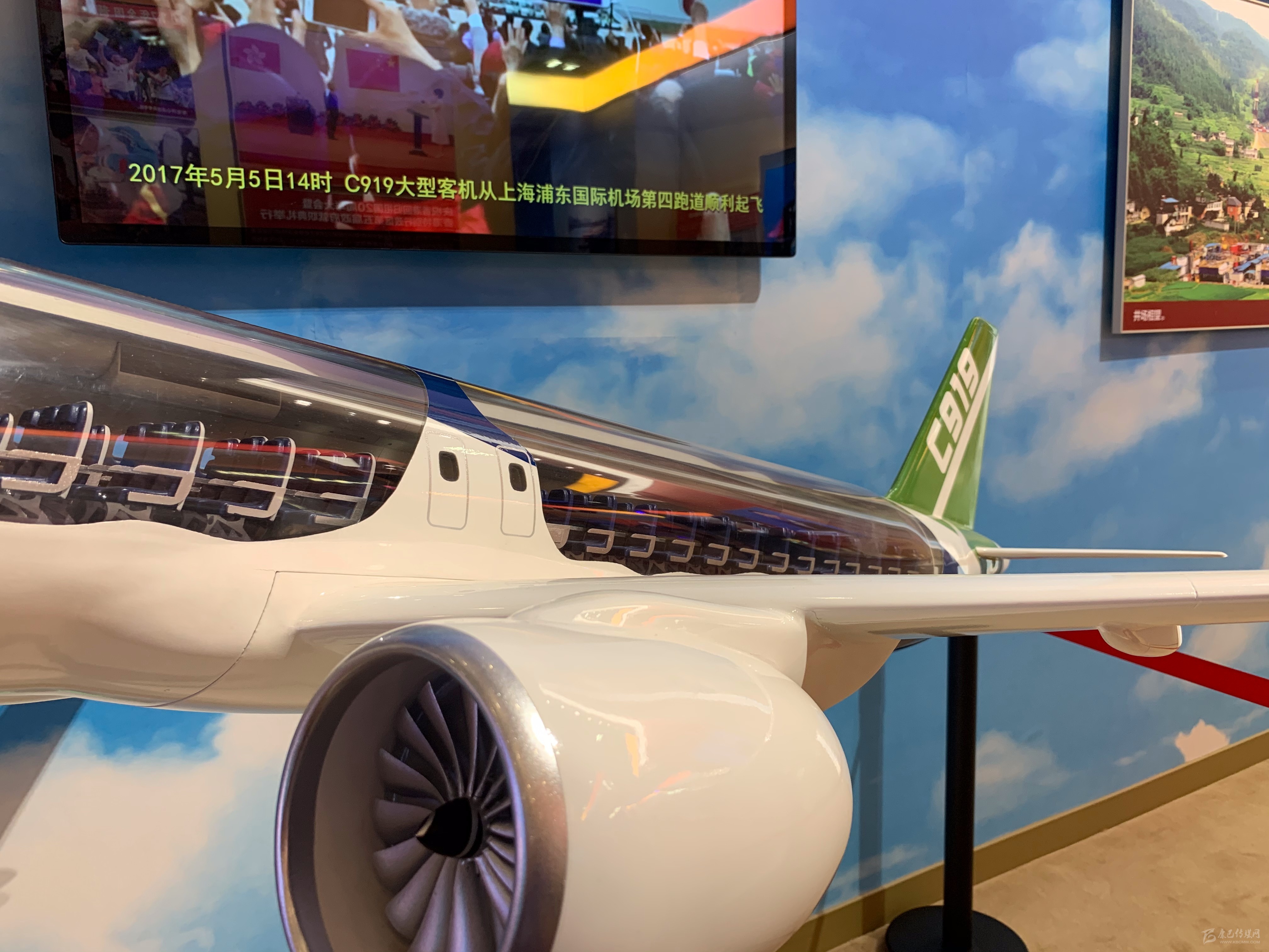 在2017年展區(qū),C919大飛機(jī)模型,配合解說(shuō)圖片以及總裝下線當(dāng)日的視頻展出。