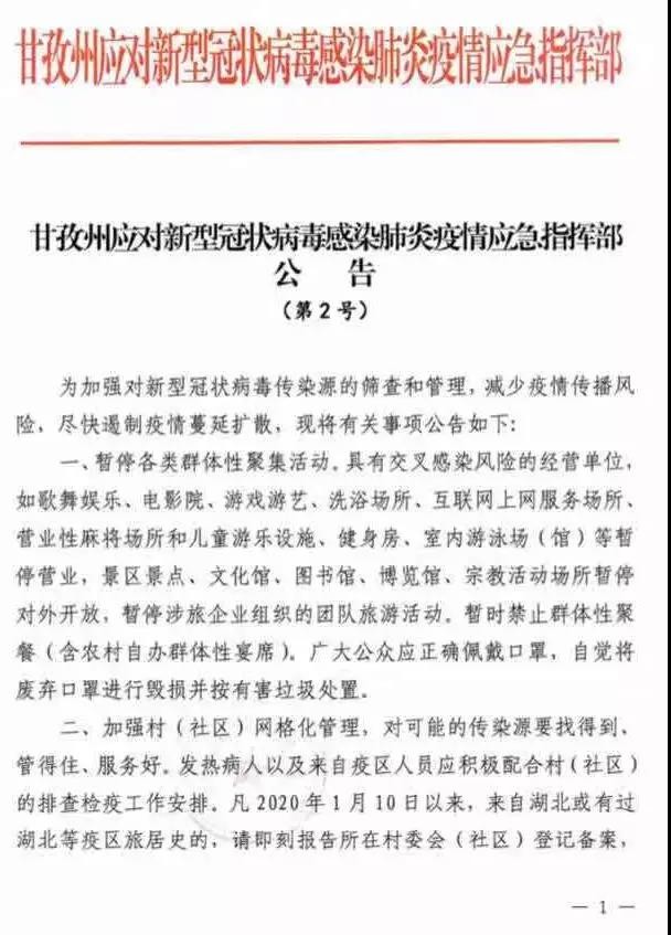 近日,甘孜州應對新型冠狀病毒感染肺炎疫情應急指揮部發布第1號、第2號、第3號公告。