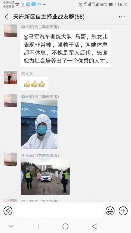 通過天府新區退役軍人事務局的協助,馬相汶順利成為了一名志愿者。他告訴工作人員說,“我是軍人的子女,身上流著軍人的血,請安排我到最危險、最艱苦的防控一線去戰斗。”經過培訓,她被安排到黑大路國道交通卡點,負責對過往乘客進行體溫檢測和疑似排查等工作。