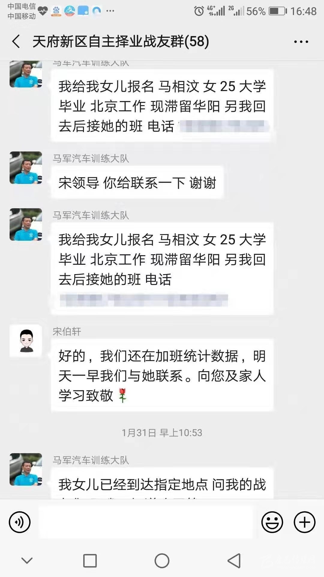 “我給我女兒報名,馬相汶,女,25歲,大學畢業,北京工作,現滯留成都,另我回去后接她的班。”近日,一條微信截圖傳遍了天府新區退役軍人的朋友圈。