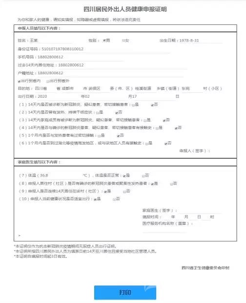(二)服務內容。居住地醫療衛生機構對申報人在開展流行病學史調查、測量體溫的基礎上,為符合條件的申報人出具《四川外出人員健康申報證明》。