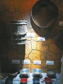 三河村村史館內陳列的吊鍋、石磨和彝族漆器等生活用具。