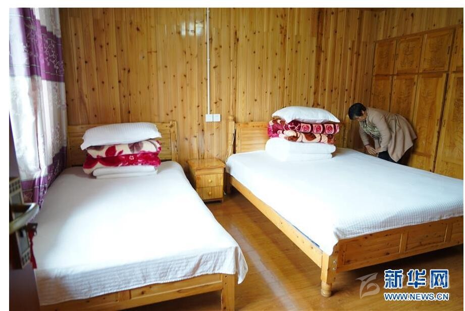 4月19日,在蘆山縣龍門鎮白伙新村,村民在自家民宿整理房間。