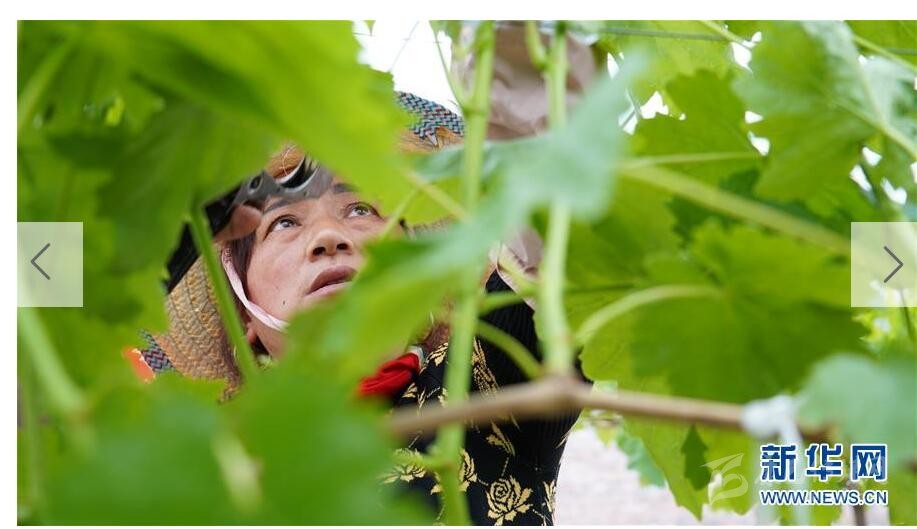 4月20日,在蘆山縣紅星村好農夫家庭農場,工人在固定葡萄藤蔓。這家農場采取“種養循環”模式,用雞鴨糞給農作物提供肥料。