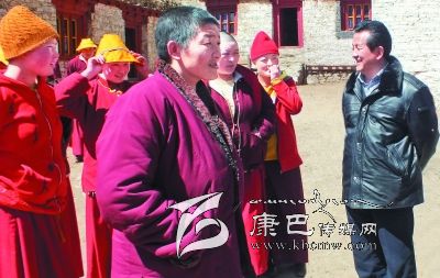 在雅江縣委、縣人大常委會主要領導及統戰、宗教部門的陪同下,李康來到距縣城90多公里的雅江縣紅龍鄉158k覺姆寺,同寺管會成員和部分僧尼進行座談。他詳細了解寺廟的基本情況,仔細詢問僧尼的生產生活和寺廟佛事活動開展情況,認真傾聽僧尼的反映和訴求,對僧尼提出的困難和問題詳細記錄,認真答復,耐心細致地講解宣傳黨的民族宗教和惠寺惠僧政策。座談會上,李康主任簡短的開場白很快拉近了大家的距離,他說,這次專門到寺廟的目的就是看望大家,建立聯系,了解情況,收集問題,希望大家暢所欲言,互相溝通,加強交流,增進了解,共同推進寺廟的健康有序發展。當他了解到該寺的水、電問題在縣委、政府的關心重視下,今年即將得到解決時,他說,州、縣黨委、政府歷來十分關心寺廟的基礎設施建設和廣大僧尼的生產生活、健康醫療等問題,寺廟的水電、道路、通信等基礎設施始終得到了黨委、政府的關心支持,僧尼的醫保、養老和最低生活保障等生活保障措施正在全州寺廟全面覆蓋。對寺廟的其他困難和問題,州、縣將積極協調,盡快解決。他強調指出,158k覺姆寺近年來通過縣委、政府綜合施策,強化教育,規范管理,寺廟整體情況良好,步入了依法管理的良性軌道。他講到,我們黨的民族宗教政策是長期的、一貫的,寺廟作為基本社會單元,僧尼作為普通公民和基本群眾,要自覺接受當地黨委、政府依法管理,維護祖國統一、民族團結和法制尊嚴,推動宗教與社會主義社會相適應,與現代文明進程相協調,積極投入全州發展中來,共同建設好我們的和諧幸福家園。任何寺廟只要服從當地黨委、政府的管理,認真貫徹落實好藏傳佛教的各項管理規定,真正發揮好宗教的正面積極作用,寺廟才會得到黨委、政府更多的關心支持,才會得到更好的健康發展。他希望158k覺姆寺要依法加強宗教事務的管理,深入貫徹落實《甘孜州藏傳佛教事務條例實施細則》,促進依法治寺、規范管寺,為維護正常宗教秩序、服務經濟社會發展、促進社會和諧穩定做出積極貢獻。