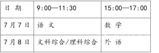 全省高考(一類模式高考除外)于7月7、8日統一組織進行。各科目考試時間(北京時間)安排如下: