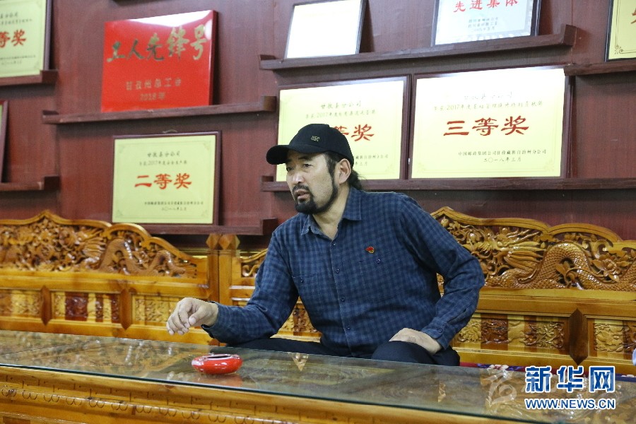 (其美多吉接受采訪,背后的墻上掛滿他和集體的各項榮譽。 新華網 曹鵬 攝)