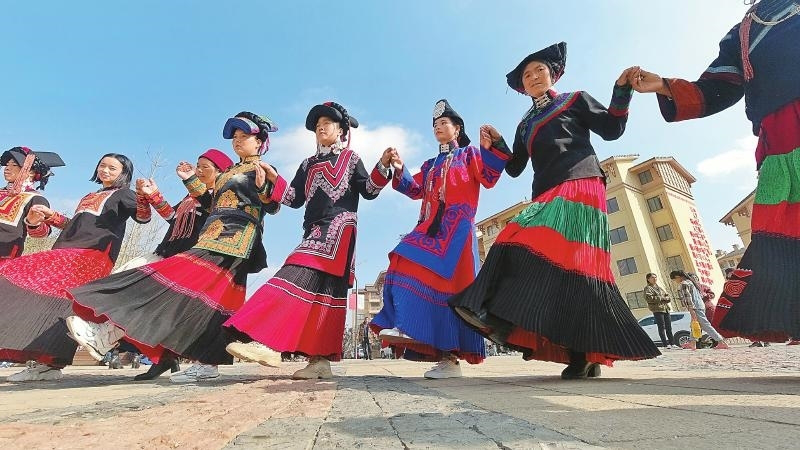人還沒到達沐恩邸社區廣場,陣陣歡快的音樂聲就傳來了。走近一看,近百名彝族群眾和游客牽手圍成一圈,踏著歌聲來回跳舞?!拔覀兲疬_體舞就是要慶祝脫貧,感恩來之不易的新生活,歡慶彝家傳統節日彝歷新年。”社區居民熱烈阿洛說。