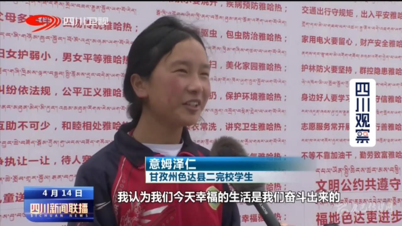 色達縣二完校學生 意姆澤仁:今天聽了叔叔阿姨話,我認為我們今天幸福的生活是我們奮斗出來的,又讓我們想起了我們學校里面的一段小標語,那就是將來的你一定會感激現在奮斗的自己。