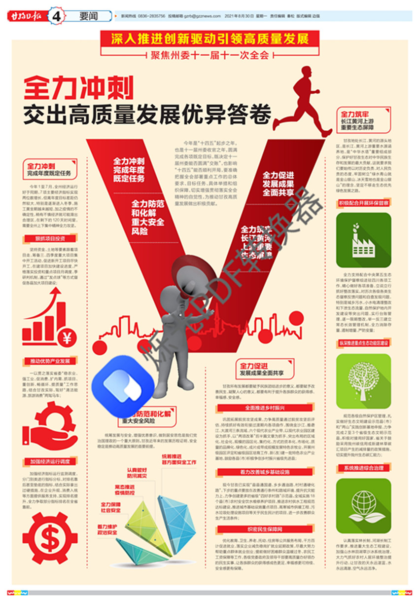 全會強調,當前和今后一個時期,全州上下要把深入學習宣傳貫徹黨的十九屆五中全會、中央第七次西藏工作座談會、中央民族工作會議、省委十一屆九次全會和州委十一屆十一次全會精神作為一項重要政治任務,圍繞建成川西北生態示范區綠色發展科技支撐體系,進一步發揮政策激勵作用、優化創新管理服務、壓緊壓實工作責任,全力推動創新發展成勢見效。要全力沖刺完成年度既定任務,狠抓項目投資,加強經濟運行調度,加快推動優勢產業發展;全力防范和化解重大安全風險,常態推進疫情防控,統籌推進各方面安全工作,全力促進發展成果全民共享,織密民生保障網;筑牢長江黃河上游重要生態屏障,堅定不移走生態優先綠色發展之路。
