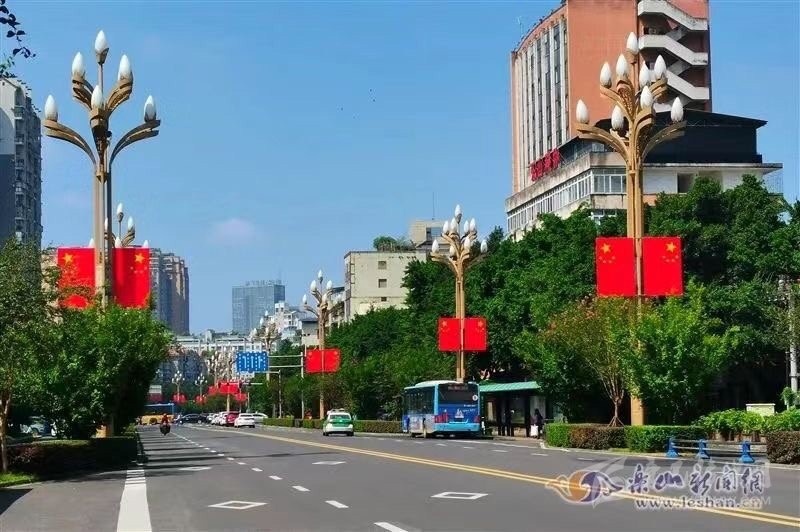 在樂(lè)山市,為營(yíng)造喜慶、熱烈、歡樂(lè)、祥和的節(jié)日氛圍,中心城區(qū)嘉定路、柏楊路等多條主干道,以及樂(lè)山岷江一橋和二橋共計(jì)1217柱燈桿上,懸掛了2000多面國(guó)旗,換上“紅裝”后的街道,在藍(lán)天的映襯下顯得格外美麗。