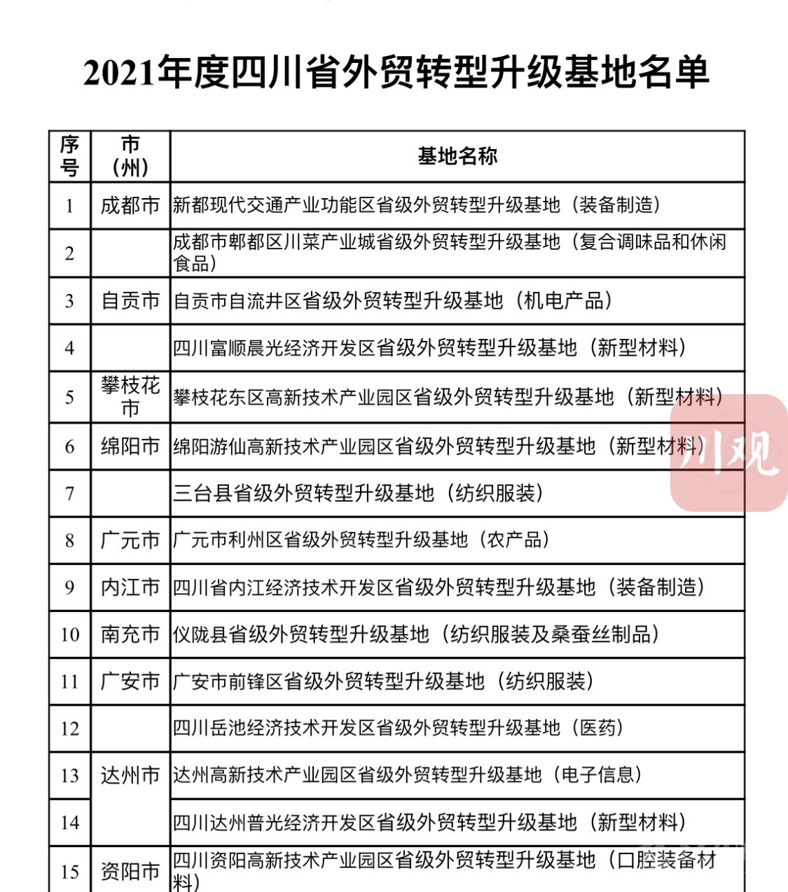 建設外貿轉型升級基地是穩定和暢通外貿產業鏈、供應鏈、推進貿易高質量發展的重要舉措。2020年,商務廳等省級9部門印發了《關于加快推進四川省外貿轉型升級基地建設的實施意見(2020—2025年)》,計劃用5年時間,在全省培育外貿基地40個。2020年,首批15個基地率先亮相。