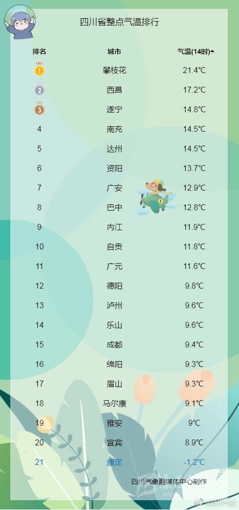 今天白天到晚上,盆地大部陰天間多云,其中巴中、南充、綿陽、遂寧4市部分地方和西部沿山有零星小雨;甘孜州西北部、東南部,阿壩州南部及涼山州東北部多云間陰有分散陣雨雪(雨),川西高原和攀西地區其余地方多云間晴。24小時內,盆地最高氣溫11~14℃;最低氣溫:北部1~4℃,南部4~7℃。