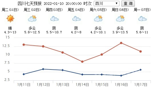 預計12日晚上到13日白天,盆地各市陰天,部分地方有小雨或零星小雨,西部北部高海拔地區有雨夾雪;川西高原和攀西地區陰天間多云有陣雪(雨),局部地方有中到大雪。
