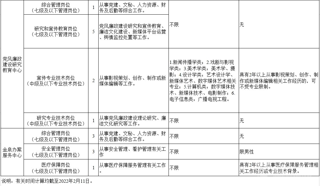 考調名額 考調事業人員25名。其中,信息技術中心管理崗位9名,黨風廉政建設研究教育中心管理崗位6名、專業技術崗位3名,金泉辦案服務中心管理崗位7名。 考調對象及條件 考調對象 全省范圍內行政單位或參公事業單位一級主任科員(含)以下職級及相當職務層次人員;縣級及以上公益一類或全額撥款事業單位管理崗位七級及以下職員、專業技術崗位中級及以下工作人員。 考調條件 具有良好的政治素質、專業素養,品行端正,實績突出,群眾公認。 中共黨員。 全日制大學本科及以上學歷,并取得相應學士及以上學位。 年齡35周歲以下(1986年2月11日及以后出生)。 歷年年度考核均為合格(稱職)及以上。 身體心理健康,具有正常履行職責的身體條件和心理素質。 符合報考崗位規定的資格條件,詳見《中共四川省紀委四川省監委2022年公開考調事業人員崗位情況表》(附后)。 符合法律、法規規定的其他條件。 有關時間計算均截至2022年2月11日。 具有下列情形之一的,不得報考: 被依法列為失信聯合懲戒對象的。 涉嫌違紀違法正在接受有關專門機關審查尚未作出結論的。 受過黨紀政務處分或司法機關刑事處罰的。 受到誡勉、組織處理等影響期未滿或期滿影響使用的。 按照有關規定,到定向單位工作未滿服務年限或有其他限制性規定的。 尚在試用期的。 按照相關規定應當回避的。 法律、法規規定的其他情形。 報名及打印準考證 2022年2月22日上午8:00至2月26日下午18:00,報名人員登錄四川省人力資源和社會保障廳官網(http://rst.sc.gov.cn/)首頁“人事考試”專欄進行網上報名,每人限報一個崗位。 對報名人員進行網上資格初審,通過資格初審者可于2022年3月1日上午8:00至3月2日下午18:00,登陸報名系統打印筆試準考證。 考試 考試分筆試和面試。其中,信息技術崗位A、信息技術崗位B、宣傳專業技術崗位需加試專業測試。 根據筆試情況,擇優確定進入面試的人選,并適時開展資格復審和心理素質測試。資格復審、心理素質測試、面試時間和地點另行電話通知。 考察、體檢及試用 考察 根據考試情況,擇優差額確定進入考察對象,深入考察了解人選政治表現、工作能力、廉潔自律和性格特點等。 體檢 根據考察情況和職位要求,擇優等額確定進入體檢人選,參照《公務員錄用體檢通用標準(試行)》進行體檢。 頂崗試用 綜合人選考試成績、考察情況,根據工作需要和人崗相適原則,擇優確定頂崗試用人選。 調入 試用期滿后,根據考調名額和試用期間表現,研究確定擬調人員,經公示后按規定程序辦理調入手續。 注意事項 報考者應保證提供真實、準確、全面的個人信息和資料,如有弄虛作假的行為,將按有關規定嚴肅處理。 資格審查貫穿考調全過程,任一環節發現有不符合考調條件的,取消考調資格。 報名時請按要求填寫本人手機號碼,并保持通訊暢通。未入圍下一環節人員,不再另行通知。 進入資格復審者,需由有干部管理權限的主管部門出具同意考調的書面意見并加蓋公章。 嚴明考調紀律,報名者不得托人說情、打招呼,一經發現即取消資格。 遵守疫情防控相關規定,服從工作人員安排。 同時,四川省紀委監委還提供相關咨詢電話:028—62555435;62555354。 (點擊查看大圖)