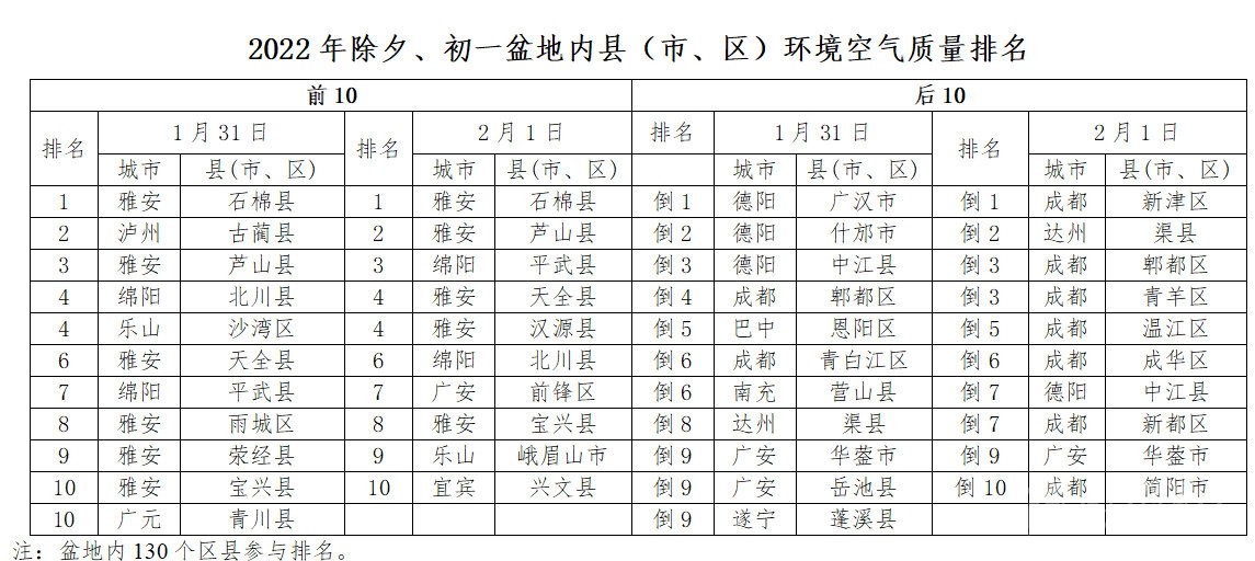 為督促各地加強煙花爆竹燃放管控,四川省生態環境廳還對盆地內130個縣市區的空氣質量進行了排名。