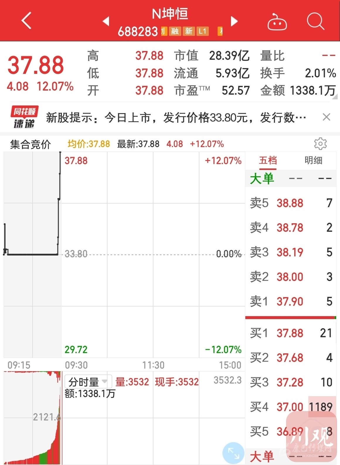 2月15日上午,四川企業成都坤恒順維科技有限公司在上海證券交易所西部基地敲響上市鑼聲。首日發行價33.8元,開盤價為37.88元,漲幅12.07%。