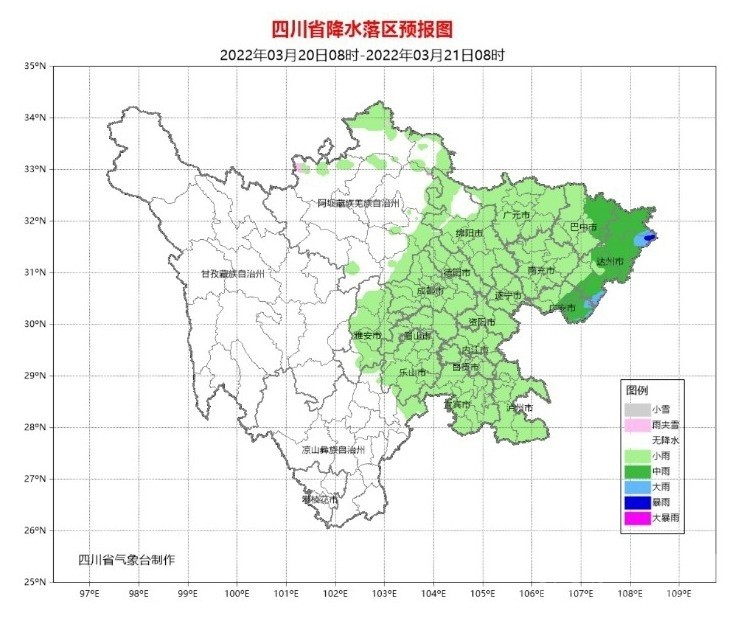 21日白天到晚上,盆地各市陰天間多云,廣元、綿陽、德陽、巴中、達州、南充、廣安、瀘州、雅安9市和成都西部、樂山南部有小雨,其中達州局部有中雨;阿壩州和甘孜州北部、涼山州東北部多云間陰有陣雨(雪),局地中雨(雪),甘孜州南部和攀西其余地方多云見晴。