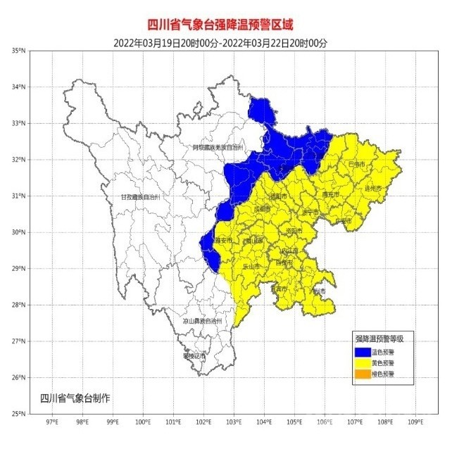 3月18日下午以來,四川省成都、南充、廣元、眉山、內(nèi)江、綿陽、雅安、遂寧、樂山、瀘州、資陽、眉山、宜賓13市都發(fā)布了強降溫黃色預警,德陽、巴中2市發(fā)布了強降溫藍色預警,廣安、內(nèi)江2市于3月19日升級發(fā)布了強降溫黃色預警。