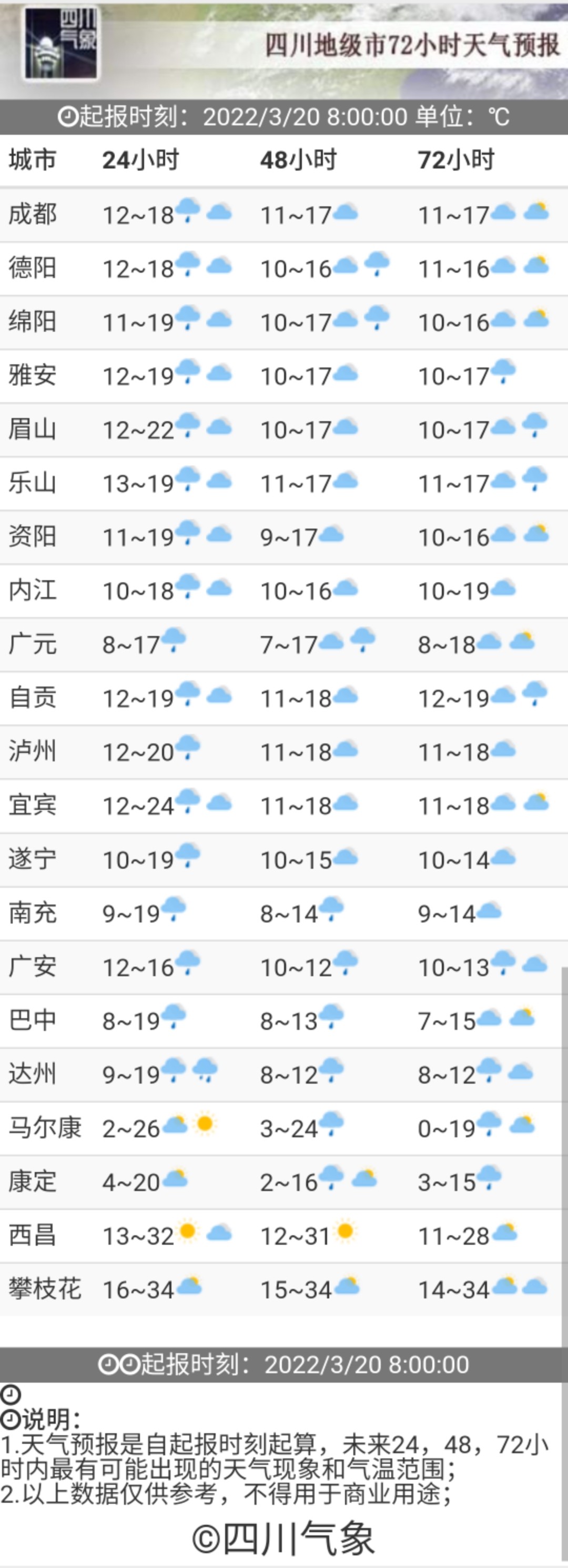 早在3月18日,四川省氣象臺便發(fā)出了強降溫黃色預警。預計19日傍晚~22日,盆地和涼山州東北部將有一次明顯的降溫降雨天氣過程,日平均氣溫將累計下降7~12℃,最高氣溫將下降15℃或以上;冷空氣影響時有3-5級偏北風,山口河谷風力可達6級或以上,局部地方有短時強降水、雷暴大風或冰雹等強對流天氣,其中盆地東北部、中部和南部有大雨到暴雨。