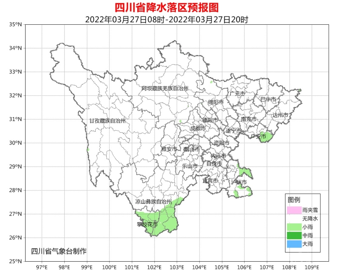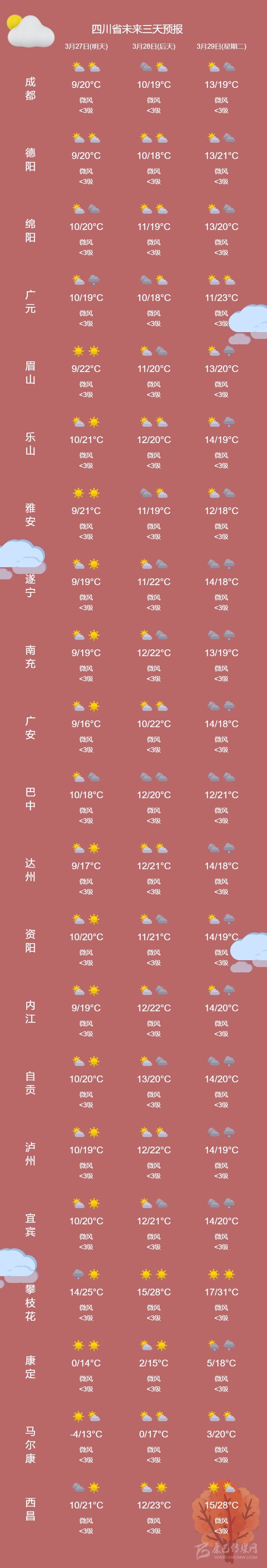 預計28~29日盆地大部多云,局部陣雨,川西高原和攀西地區晴間多云;30日~4月2日我省有一次降溫、降水天氣過程,其中盆地大部和攀西地區及川西高原東部南部有小到中雨,局部大雨。