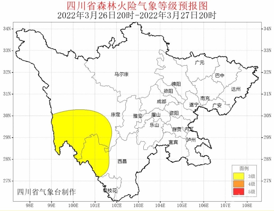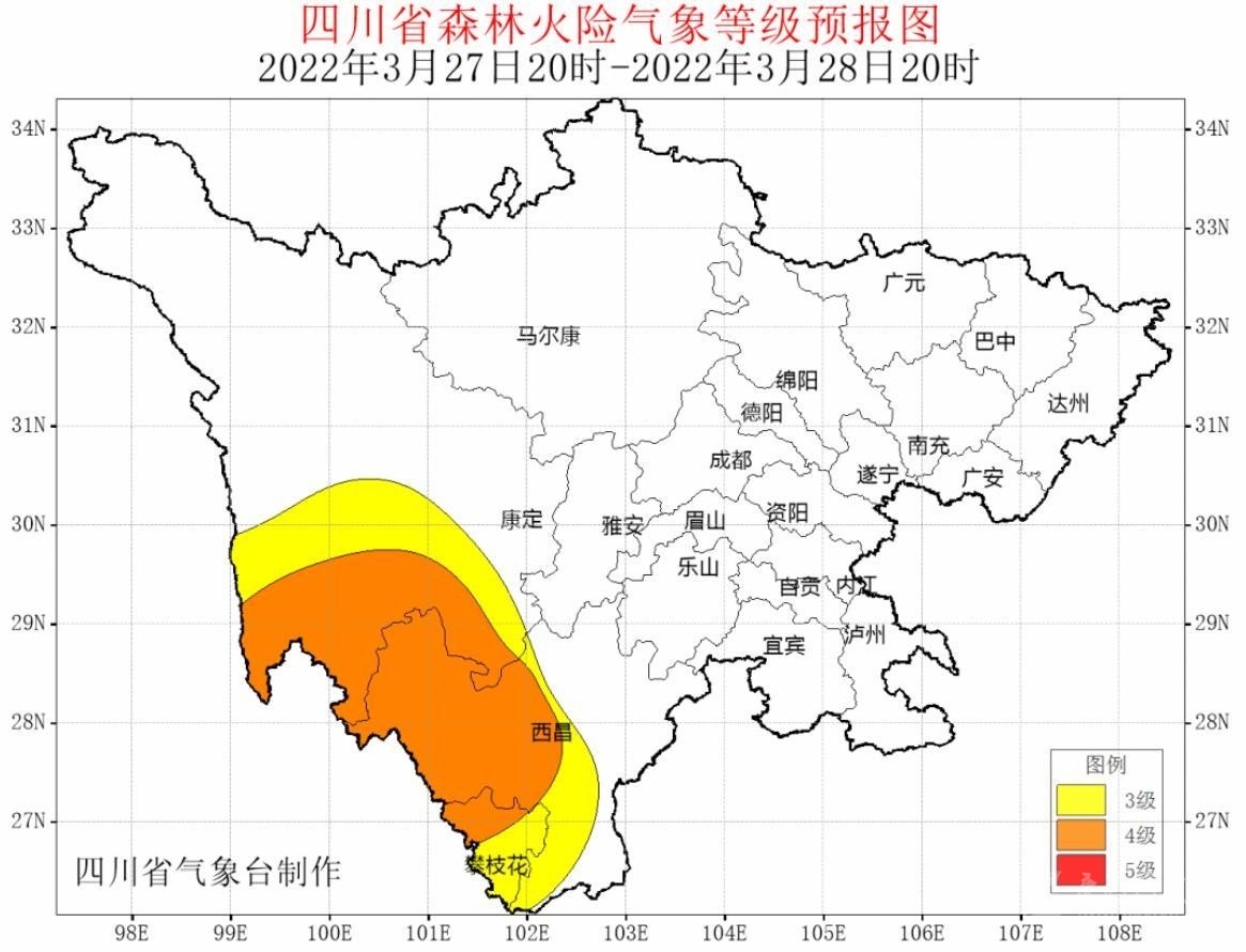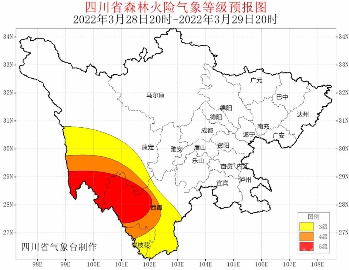 據最新氣象資料分析:3月27日~29日,攀西地區西部和甘孜州南部以多云間晴天氣為主,氣溫升高,森林草原火險氣象等級可達3~5級。
