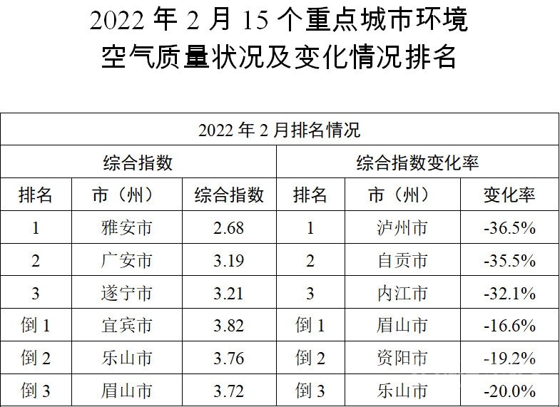 四川省生態環境廳副廳長李銀昌介紹,今年2月,全省15個重點城市環境空氣質量均呈改善趨勢,改善同比較好的前3名依次為瀘州市、自貢市、內江市,改善同比較好的后3名依次為眉山市、資陽市、樂山市。6個非重點城市空氣質量綜合指數排名依次為甘孜州、阿壩州、涼山州、巴中市、廣元市、攀枝花市。