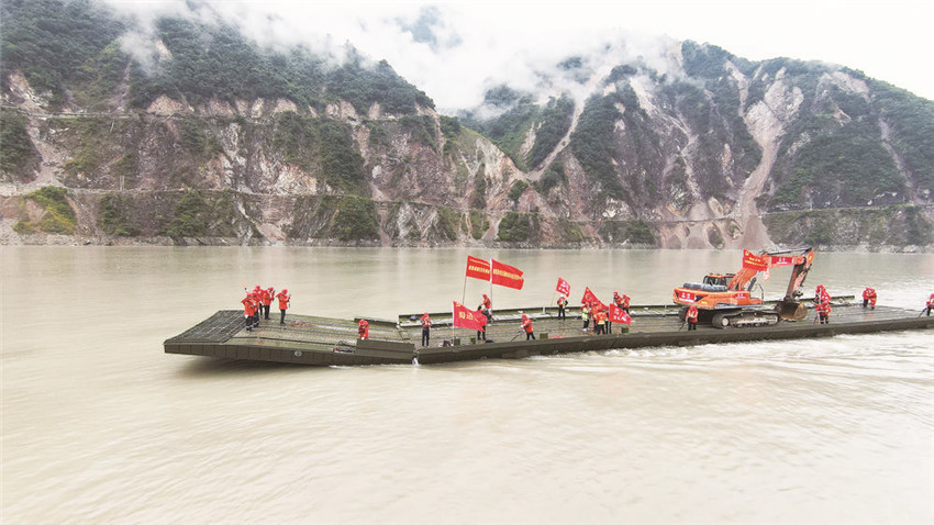 中午,天空再次傳來直升機的轟鳴聲。這次機會不能再錯過,一名特警站在一輛商務車車斗里,手持一面國旗,由一人開著汽車奔馳。汽車奔馳,紅旗招展,鮮艷奪目的一抹紅在高山峽谷之間奔騰涌動,吸引了直升飛機的“目光”。隆隆的機聲越來越響,龐大的“鐵鳥”越飛越近,最后穩穩地停棲在三號營地的開闊場壩。期待已久的108人一下歡呼起來,胡娜如釋重負。