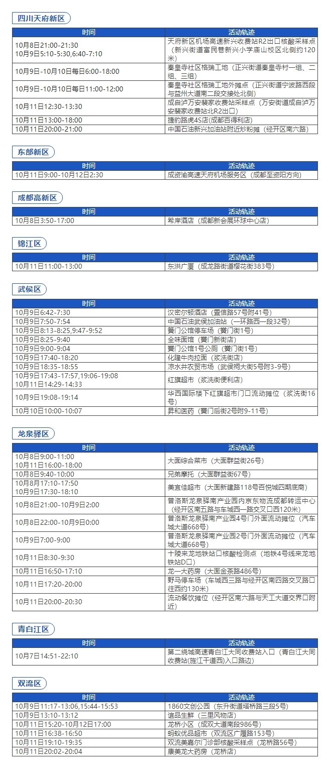 近期新增感染者在蓉軌跡現公布如下,如與以下活動軌跡有重疊,立即向社區和單位(或居住的酒店)報備,三天內接受三次核酸檢測(間隔24小時),期間做好個人防護,不聚會、不聚餐。如有疑問,請撥打12345咨詢。