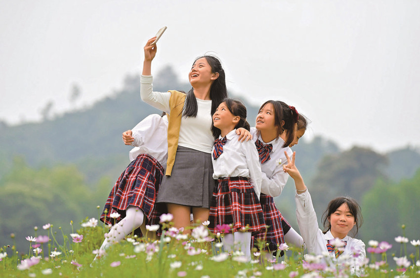 在江西省新余市分宜縣洞村鄉(xiāng),老師鐘琳珊(左二)帶著合唱團的孩子在戶外練歌玩耍,合影留念(2022年5月25日攝)。 新華社 發(fā)