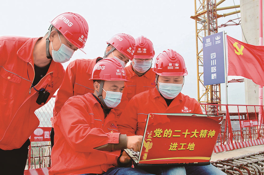 十月十六日,瀘州河東長江大橋納溪岸施工現場,四川路橋建設集團股份有限公司的員工在收看黨的二十大開幕會盛況。 周超華 攝