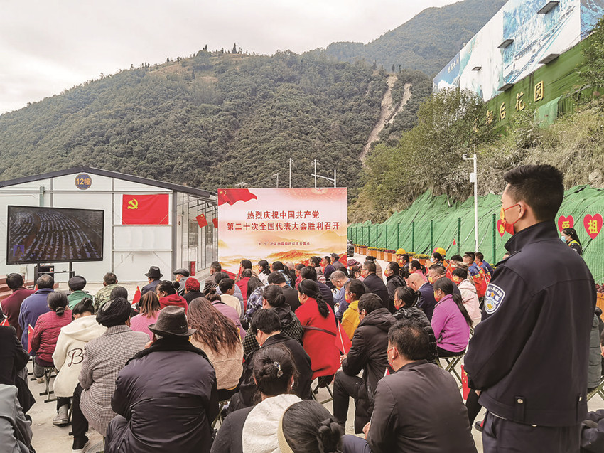 “9·5”瀘定地震磨西過渡安置點干部群眾集中收看黨的二十大開幕會盛況。