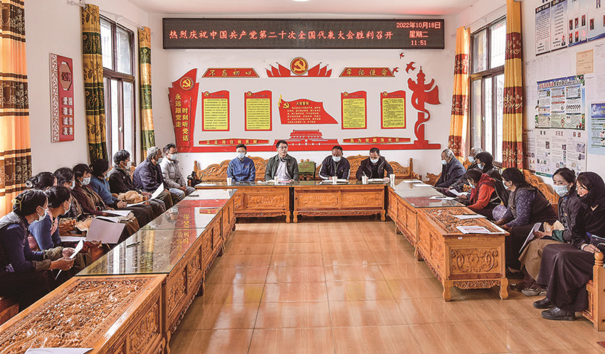 甘孜日報社黨委工作組與稻城縣噶通鎮(zhèn)干部群眾熱議黨的二十大報告。