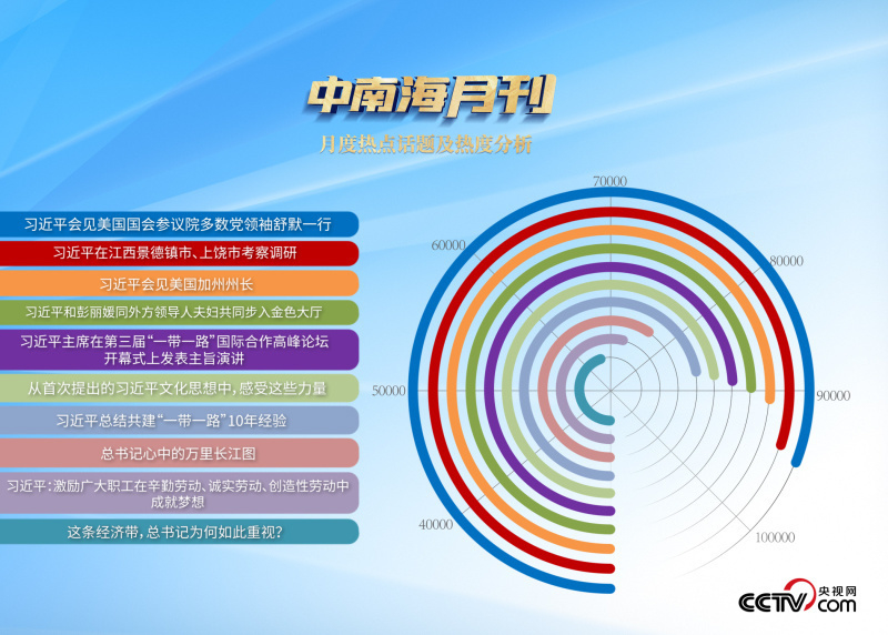 央視網“智聞”系統提取分析10月全網時政新聞熱點顯示,“習近平主席會見美國國會參議院多數黨領袖舒默一行”“習近平會見美國加州州長”“習近平主持召開進一步推動長江經濟帶高質量發展座談會”等話題最受網民關注。