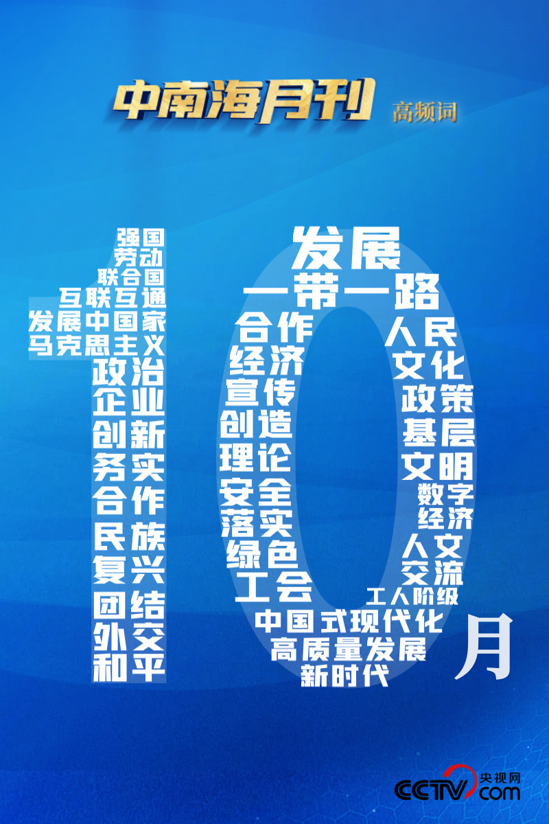 高頻詞蘊含著習近平總書記治國理政的深邃思想與生動實踐。央視網I學習數據庫梳理分析習近平總書記10月重要講話顯示,“發展”“合作”“人民”等詞持續高頻出現,“一帶一路”“文化”等詞特別引人關注。