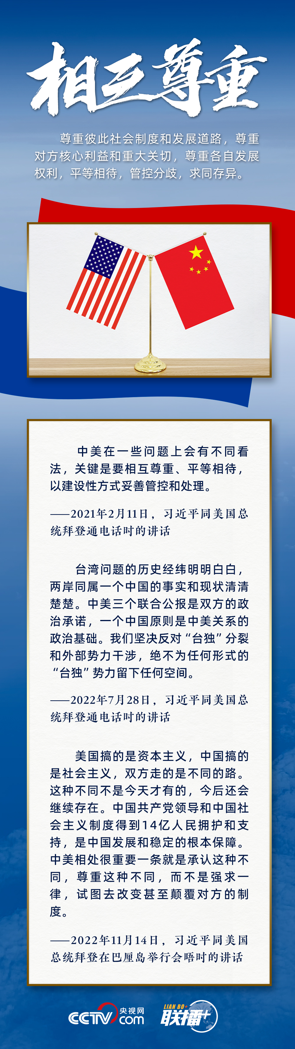“中美不沖突、不對抗、和平共處,這是兩國最基本的共同利益。”習主席指出,遵守國際關系基本準則和中美三個聯合公報,這是雙方管控矛盾分歧、防止對抗沖突的關鍵,也是中美關系最重要的防護和安全網。