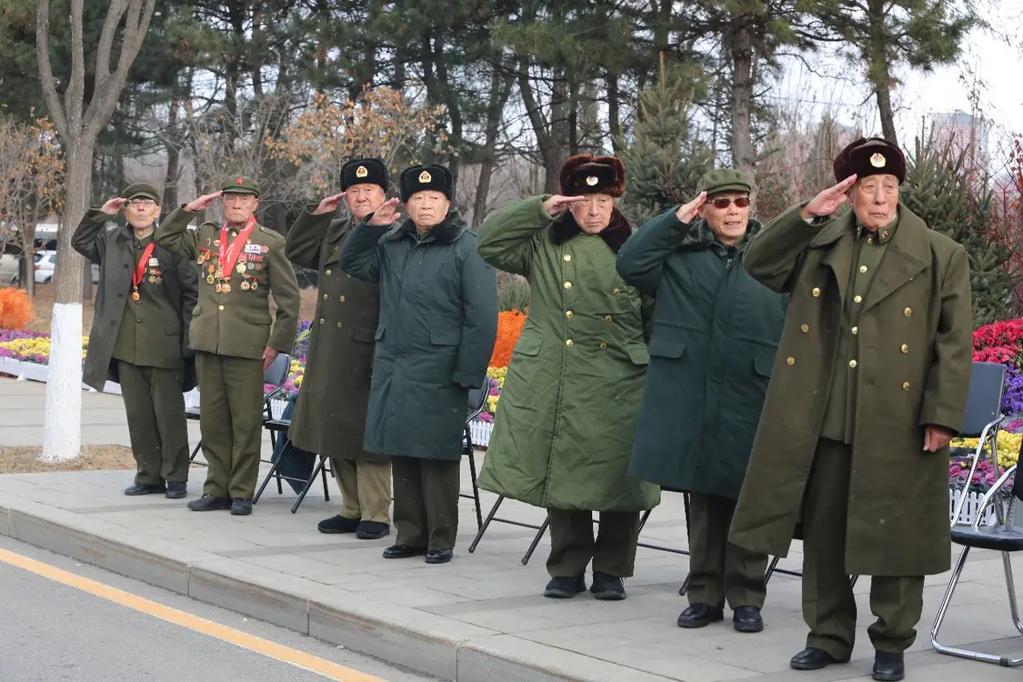 當護送志愿軍烈士遺骸棺槨的騎警車隊即將抵達沈陽抗美援朝烈士陵園時,幾位已過耄耋之年的志愿軍老戰士顫顫巍巍地從凳子上起身。他們舉起右手,一齊向迎面駛來的車隊敬禮。