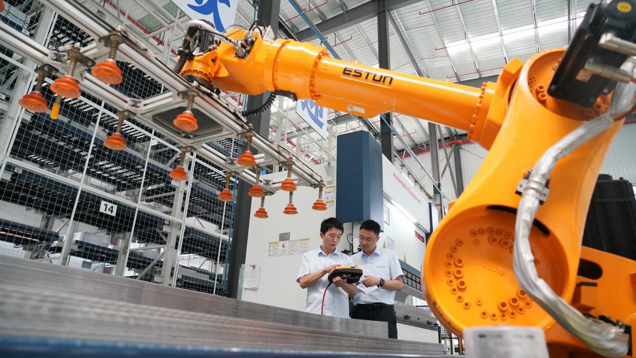 △2023年8月26日,在武漢光谷的一家長江電氣企業智能車間,工作人員正在操作智能機械臂。